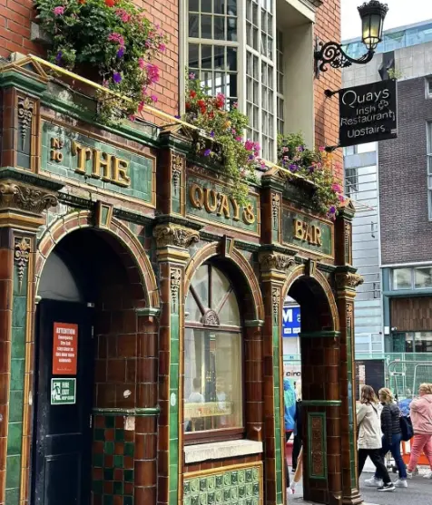 The Quays Bar occupies a prominent corner location with a stunning Victorian tiled exterior making it one of Temple Bar’s most photogenic pubs after the famous red Temple Bar Pub itself. The corner position stretches the interior further back than the facade initially suggests, creating more space than single-frontage pubs.
